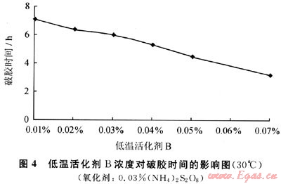 由圖4可以看出,在氧化劑濃度不變,破膠時(shí)間隨著低溫活化劑濃度的增加而減少。