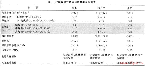 根據(jù)以上研究及評價,得出我國煤層氣選區(qū)評價參數(shù)及標準(表1)。