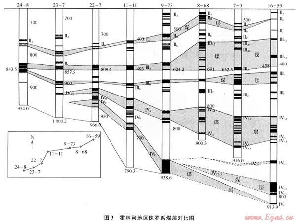 下含煤段分為Ⅰ、Ⅱ、Ⅲ、Ⅳ共4個煤組,煤層厚度巨大,可采煤層平均總厚度76.91m。該區(qū)存在2個富煤中心,分別位于煤盆北部的翁能花向斜和南部的西南向斜。煤層層數(shù)多,但煤層沿走向、傾向的分岔(變薄、尖滅)明顯(圖3),該區(qū)煤層氣勘探的主力層位為ⅡB、ⅢA、ⅢB、ⅣC?;袅趾拥貐^(qū)煤層的埋藏深度大多淺于1000m,只在向斜軸部煤層埋藏深度大,煤層總體沿盆地東南邊緣向盆地中心,其埋深逐漸增大。滕玉洪等根據(jù)煤田做的瓦斯含量解析資料的計算結(jié)果,霍林河地區(qū)甲烷風化帶的埋藏深度為416.8m[9]。因此煤層氣勘探的深度為400~1000m。