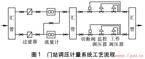 天然氣門站是城市天然氣輸配系統(tǒng)的氣源點(diǎn),應(yīng)具備過(guò)濾、調(diào)壓、計(jì)量、安全切斷、運(yùn)行路和備用路自動(dòng)切換等主要功能,確保供氣的連續(xù)性、安全性和穩(wěn)定性。為保證天然氣門站供氣的可靠性,在其計(jì)量單元和調(diào)壓?jiǎn)卧O(shè)有備用路[4]。門站調(diào)壓計(jì)量系統(tǒng)工藝流程見(jiàn)圖1。