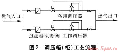 用戶調(diào)壓箱(柜)的功能是接受城市中壓管網(wǎng)來(lái)氣,并將天然氣壓力降至2500~3000Pa,輸送至庭院低壓管道供應(yīng)居民用戶使用[11]。調(diào)壓箱(柜)工藝流程(采用兩路調(diào)壓)見(jiàn)圖2。