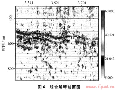 為更好地突出煤層氣AVO異常,把截距、梯度數(shù)據(jù)體進(jìn)行相減運算,取差值的振幅包絡(luò)屬性作圖,獲得綜合解釋剖面圖(圖6)。由于煤層氣的AVO異常特點是截距與梯度符號相反,因此差值增強了與煤層氣富集相關(guān)的AVO異常,而削弱AVO反演噪音。截距、梯度差值的包絡(luò)屬性,將把頂、底板反射界面相關(guān)的同相軸異常合并顯示為同一個同相軸,突出了AVO異常范圍。圖6中沿2條藍(lán)線(即5#煤層頂板、底板的位置)的紫紅色位置是煤層氣富集區(qū)。