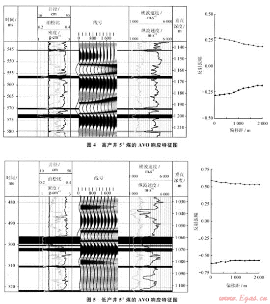 結(jié)果發(fā)現(xiàn):①高產(chǎn)井5#煤層的頂板反射界面對應(yīng)的是地震剖面的負(fù)同相軸,反射振幅隨偏移距的增加而減小,呈現(xiàn)較強的負(fù)截距、正梯度異常;底板反射界面對應(yīng)的是地震剖面的正同相軸,其反射振幅也隨偏移距的增加而減小,但呈現(xiàn)較強的正截距、負(fù)梯度異常。此結(jié)果證明高產(chǎn)井的儲層一般能夠形成較強的AVO異常(圖4)。②低產(chǎn)井5#煤層儲層頂、底板反射界面分別對應(yīng)地震剖面的負(fù)同相軸和正同相軸,但正、負(fù)同相軸的反射振幅基本上不隨偏移距的變化而變化,幾乎無AVO異常或AVO異常很弱(圖5)。
