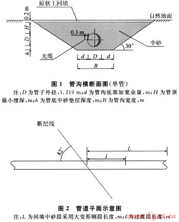 地震斷裂帶兩側各30m范圍外的管溝開挖,按正常管溝開挖的要求進行施工,即在一般地段管溝挖深不小于2.4m(卵礫石段管溝超挖0.2m),管溝底寬2.0m(石方段管溝底寬為2.4m)。