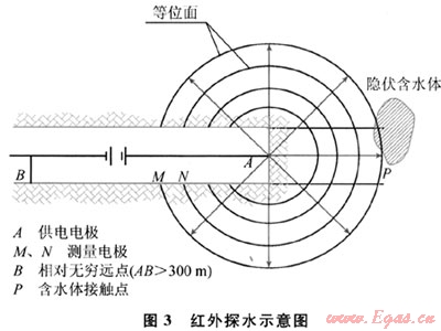 HY-303紅外探水儀,能探測(cè)20~30m范圍內(nèi)的地下水狀況?;驹恚寒?dāng)掘進(jìn)前方30m范圍內(nèi)存在含水構(gòu)造或溶洞時(shí),前方災(zāi)害源產(chǎn)生的紅外異常場(chǎng),必然會(huì)傳播到掘進(jìn)后方,因而在掘進(jìn)后方隧道的側(cè)壁上能提前發(fā)現(xiàn)災(zāi)害源產(chǎn)生的紅外異常場(chǎng)。其特點(diǎn)為:①距離短,一般為35m;②只定性告知35m范圍內(nèi)有無(wú)水,至于水壓、水量、具體哪個(gè)里程則探測(cè)不出;③適用于任何地層中定性判斷探測(cè)點(diǎn)前方“有沒(méi)有水”及水體存在方位;④儀器小巧輕便,操作簡(jiǎn)單,可實(shí)現(xiàn)全空間全方位探測(cè);⑤資料分析簡(jiǎn)潔、快速、直觀(guān);⑥基本不占用隧道施工時(shí)間。