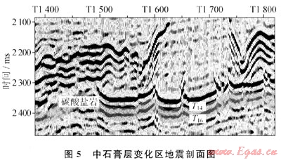 由圖7可見,在中石膏層受擠壓消失或減薄的區(qū)域,碳酸鹽巖頂?shù)捉缑嬖跁r間剖面上出現(xiàn)下拉,形成“眼球”;如果鹽巖中存在石膏夾塊,則引起下覆碳酸鹽巖頂?shù)追瓷渫噍S錯斷,這顯然會使解釋進入誤區(qū)。由此可提示,在石膏層變形較強烈的地區(qū),地震解釋要特別關(guān)注中石膏缺失和減薄的區(qū)域。