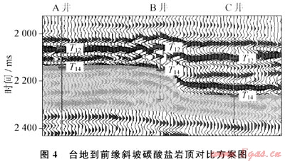 理論記錄與實際地震剖面的對比表明,從臺地相到前緣斜坡相,碳酸鹽頂界反射(T14)“竄相位”。這證明了井資料標(biāo)定結(jié)果的準(zhǔn)確性。圖中還可以看出,前緣斜坡相碳酸鹽巖反射振幅能量比臺地相的要弱一些,這與實際地震記錄的情況也是一致的。據(jù)此,落實了碳酸鹽巖頂界的解釋與對比方案(圖4)。