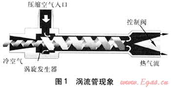 渦流管又稱Ranque Hilsch管,是一個沒有運動部件、結構非常簡單的能量分離裝置[1]。氣體在降壓過程中,經過特殊設計的渦流管時,可以分為冷熱兩股氣流,這種現(xiàn)象稱為渦流管現(xiàn)象,見圖1。
