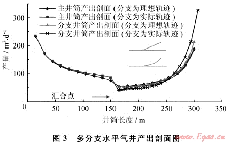 如圖3所示(以一分支井為例),彎曲分支對(duì)主井筒的產(chǎn)出剖面影響更大(圖中匯合點(diǎn)處),而分支井筒的產(chǎn)出剖面兩者也有很大區(qū)別。因此,在實(shí)際產(chǎn)能預(yù)測(cè)過程中,必須選用根據(jù)實(shí)際鉆井軌跡來劃分分支井段,從而實(shí)現(xiàn)對(duì)彎曲井筒的模擬,達(dá)到更好的預(yù)測(cè)效果。