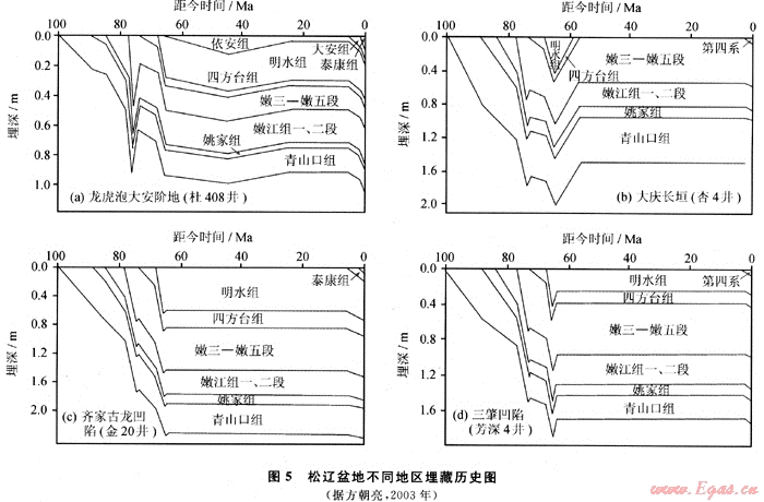 埋藏史研究結(jié)果表明,松遼盆地北部從青山VI沉積開始,不同地區(qū)的埋藏史有所差異(圖5),正是這種埋藏歷史的差異是導(dǎo)致松遼盆地北部油氣聚集成藏的主要動力學(xué)原因之一。
