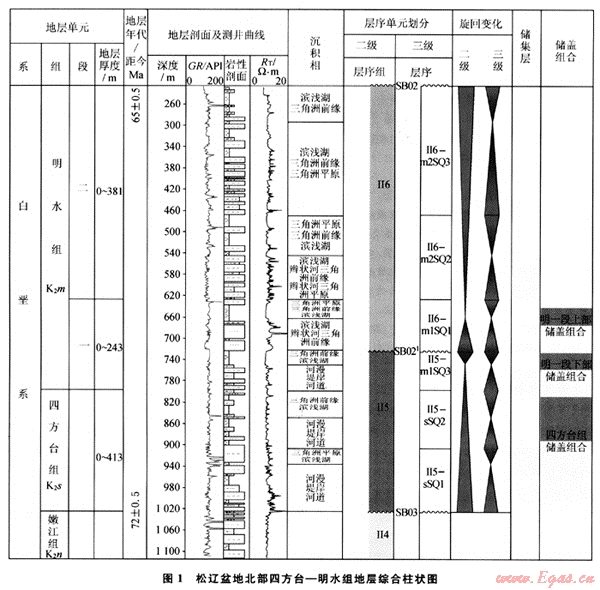 松遼盆地在演化過程中經(jīng)歷了不同的構(gòu)造運動期次,不同的期次發(fā)育不同的沉積特征,在松遼盆地晚期四方臺組和明水組總體以氧化-半還原環(huán)境為主,在平面上以廣闊的泛濫平原、淺水湖泊三角洲和濱淺湖相為主,四方臺組初期發(fā)育的泛濫平原河道可以作為有效的儲集層,另外四方臺組晚期和明水初期所發(fā)育的濱淺湖泥質(zhì)沉積可作為上覆蓋層,同時配合下伏的生油巖、斷裂輸導(dǎo)通道、有效圈閉和油氣運聚保存的空間配置關(guān)系,可以構(gòu)成良好的成藏組合(圖3)。