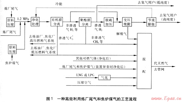 許多城市的煉油廠都與燃氣生產企業(yè)為鄰,甚至雙方已經形成了良好的合作關系,附近有城市燃氣管網,鋼鐵生產企業(yè)也可能與此距離不遠。照此看來,如果能將鋼鐵企業(yè)、石化企業(yè)與燃氣企業(yè)聯(lián)合起來,在兼顧各方利益的前提下,采用經濟的方式首先提取煉廠尾氣和焦爐煤氣中的氫氣組分就近利用,之后將其他所有剩余氣體經過簡單處理后制成符合要求的代天然氣產品供應城市燃氣管網,那么,聯(lián)合體各方就會各得其所,實現優(yōu)勢互補,互利互惠。在合作各方獲取效益的基礎上,同時使能源利用價值達到最高化,圓滿解決煉廠尾氣和焦爐煤氣中各組分物盡其用的問題。