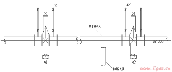 在天然氣中高壓管線上,一般2~3KM(有的甚至長(zhǎng)達(dá)5KM)方有控制閥門,下以長(zhǎng)3KM的DN300鋼管兩閥中間部分需斷管碰頭為例簡(jiǎn)單說(shuō)明:(如下圖示)