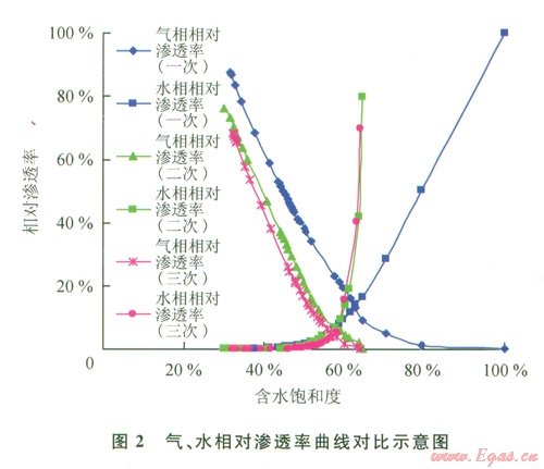 隨著氣、水互驅(qū)輪次的增加,氣、水兩相區(qū)間收窄,氣相滲流等滲點(diǎn)下移。表明氣庫經(jīng)長期運(yùn)行,儲層受邊水運(yùn)移影響孔隙空間可利用程度逐步降低,氣相滲流阻力逐步增加,影響氣庫擴(kuò)容及注采效果。