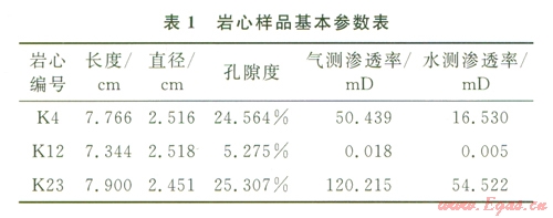 實(shí)驗(yàn)樣品選取某水驅(qū)砂巖氣藏型儲氣庫儲層巖心,代表地下儲氣庫高、中、低各類滲透率級別的儲層,樣品基礎(chǔ)參數(shù)見表l。