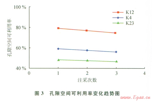 利用各輪氣、水互驅(qū)的束縛水、殘余氣飽和度,計算各類儲層巖心孔隙空間可利用率,結(jié)果見圖3。經(jīng)3輪氣、水互驅(qū),各類儲層孔隙空間可利用率的差距較為明顯,高、中、低滲率層孔隙空間可利用率分別為46.5%、56.0%、74.0%,并且隨著氣、水互驅(qū)輪次的增加,儲層孔隙空間可利用率表現(xiàn)為下降趨勢。其中低滲透率層孔隙空間可利用率下降幅度較大,表明由于孔喉發(fā)育較差,低滲透率儲層孔隙空間動用能力受水驅(qū)效果影響更加明顯。