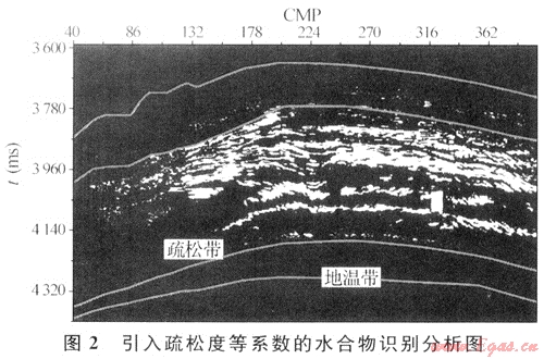 采用疊前AVO反演求得縱橫波速度信息[7]。通常海洋中淺層地層的地震縱波速度為1.6~1.8km/s,在含天然氣水合物層中,地震波速度將提高至1.85~2.5km/s,在速度剖面上,水合物層的層速度變化趨勢呈典型的三段式,即上下低,中間高。同時(shí)結(jié)合疏松系數(shù)、地?zé)崽荻鹊葏?shù),可以提高水合物識別的可信度(圖2)。