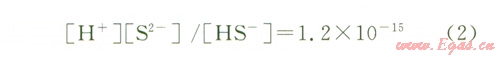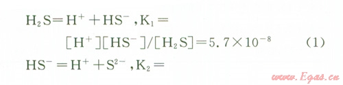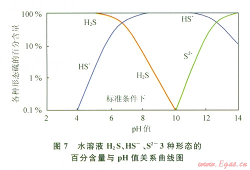 主要存在H2S、HS-、S2-3種形式。根據(jù)上式可以繪出H2S、HS-S2-3種形態(tài)硫在不同pH值下的摩爾百分含量圖(7[8])。