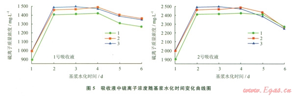實(shí)驗(yàn)評(píng)價(jià)了基漿水化時(shí)間對(duì)吸收液吸收效果的影響,對(duì)兩套吸收液l號(hào)(+4%膨潤(rùn)土+0.5%無(wú)水碳酸鈉)2號(hào)(+4%膨潤(rùn)土+0.5%無(wú)水碳酸鈉+0.2%除硫劑)進(jìn)行3次重復(fù)實(shí)驗(yàn),結(jié)果見圖5。