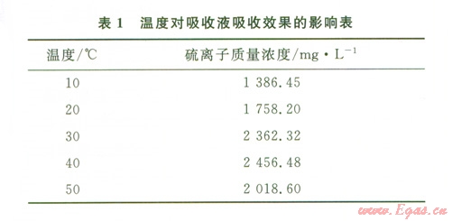 經(jīng)過(guò)多次實(shí)驗(yàn)發(fā)現(xiàn)不同室溫條件下所測(cè)數(shù)據(jù)有較大差異,在其他實(shí)驗(yàn)條件相同的情況下,隨溫度升高,吸收液中硫離子濃度顯著升高。因此在吸收液吸收裝置下加恒溫磁力攪拌器以此調(diào)節(jié)反應(yīng)溫度,并評(píng)價(jià)吸收液吸收效果,結(jié)果見表1