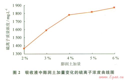 如圖2所示膨潤(rùn)土加量對(duì)吸收液吸收效果有明顯的影響,但在膨潤(rùn)土加量為4%以后,吸收液中硫離子濃度隨膨潤(rùn)土加量的增加變化不大。分析產(chǎn)生這種現(xiàn)象的主要原因是膨潤(rùn)土本身對(duì)硫化氫有一定的物理和化學(xué)吸附作用,物理吸附主要是硫化氫分子在膨潤(rùn)土表面的吸附,化學(xué)吸附主要是發(fā)生在膨潤(rùn)土膠體表面的陽(yáng)離子交換吸附。