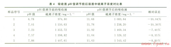 實(shí)驗(yàn)發(fā)現(xiàn),吸收液在吸收硫化氫反應(yīng)后溶液的pH值都低于l0。結(jié)合圖7中所示水溶液中硫化氫存在形態(tài)與溶液pH值的關(guān)系可知:在此pH值范圍內(nèi),吸收液中硫化氫主要以H2SHS-的形態(tài)存在。分析在這種條件下用碘量法測(cè)得的硫離子含量不能真實(shí)地反映出吸收液中硫離子的含量。因此要在滴定前調(diào)節(jié)吸收液的pH值大于11,在此pH值范圍內(nèi)溶液中硫化氫主要以S2-的形式存在。這樣可以接近真實(shí)的反應(yīng)吸收液中硫化氫的含量。取圖41號(hào)吸收液吸收硫化氫反應(yīng)后的溶液,對(duì)比分析pH值調(diào)節(jié)前后的數(shù)據(jù),結(jié)果見表4。