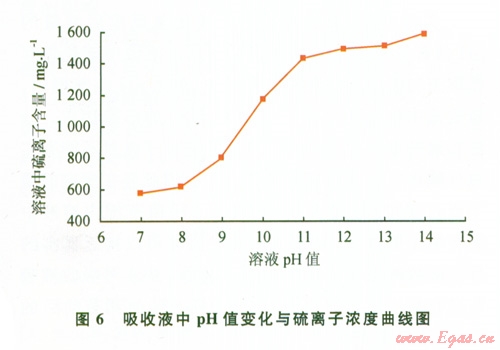 如圖6所示,隨吸收液pH值的增加,反應(yīng)后吸收液中硫離子濃度逐漸增加,當(dāng)吸收液中pH值達(dá)ll后吸收液有明顯的吸收效果,這符合鉆井現(xiàn)場(chǎng)在鉆遇含硫化氫地層時(shí)調(diào)節(jié)鉆井液pH值大于11的工藝要求。