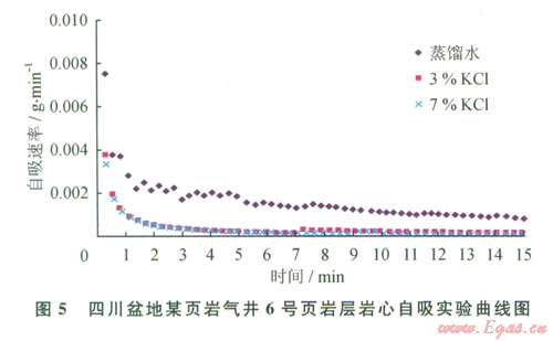 從圖4、5中可以看出:①總的吸液量極少,均表現(xiàn)為初期的吸液量最大,在前3 min吸液速率相對(duì)較大,而3 min后自吸曲線趨于平直,吸液量基本趨于零。②對(duì)于5號(hào)頁(yè)巖層,3%KCl的自吸量最大,7%KCl及未加任何添加劑的蒸餾水巖心自吸量最?。粚?duì)于6號(hào)頁(yè)巖層,未加任何添加劑的蒸餾水自吸量最大,3%KCl和7%KCl的自吸量最小。③不同層段的頁(yè)巖吸液量具有明顯的差異,與黏土礦物含量相關(guān),黏土礦物含量較高的5號(hào)巖心吸液量高于含量較低的6號(hào)巖心。