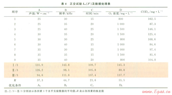 從上述實驗研究可知,單獨(dú)采用聲化學(xué)處理后CODcr還有l 382 mg/L,達(dá)不到排放標(biāo)準(zhǔn)。因此,采用聲化學(xué)復(fù)合臭氧氧化技術(shù)進(jìn)行處理,考察聲強(qiáng)、頻率、臭氧濃度、時間對處理效果影響,設(shè)計正交試驗進(jìn)行優(yōu)化工藝的確定,結(jié)果如表4所示。