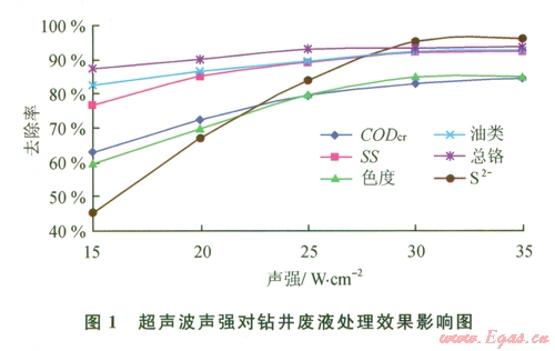 從表2可以看出,經(jīng)過聲化學(xué)復(fù)合技術(shù)對鉆井廢液進(jìn)行處理后,其處理效果非常明顯,處理后所有的污染指標(biāo)濃度均下降大,其中總鉻、油類、色度、S-2達(dá)到一級排放標(biāo)準(zhǔn);SS達(dá)到二級排放標(biāo)準(zhǔn)。CODcr從18 430 mg/L降到l 382 mg/L,去除率達(dá)到92.5%。