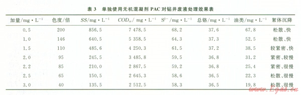 取一定鉆井廢液,調(diào)節(jié)pH值為8~9,直接用混凝劑PAC進(jìn)行混凝處理,考察處理后鉆井廢液主要污染指標(biāo),結(jié)果如表3所示。