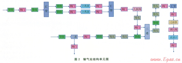 為驗(yàn)證模擬的有效性,應(yīng)用建立的輸氣站過(guò)程模擬軟件對(duì)川渝地區(qū)某輸氣站進(jìn)行壓損模擬分析。根據(jù)輸氣站實(shí)際情況,天然氣在站內(nèi)順序通過(guò)匯氣、分離、計(jì)量、過(guò)濾除塵、調(diào)壓等生產(chǎn)設(shè)備(1)。在不影響模擬流程及優(yōu)化效果的基礎(chǔ)上,考慮站內(nèi)眾多的工藝設(shè)備是輸氣站壓力損失的集中部分,將輸氣站工藝流程圖轉(zhuǎn)換成結(jié)構(gòu)單元圖(2)。