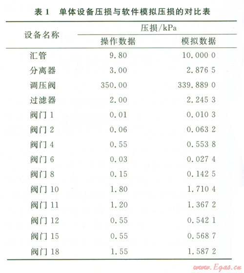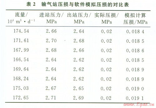通過(guò)輸氣站過(guò)程模擬軟件的模擬計(jì)算,將計(jì)算結(jié)果與各主要生產(chǎn)設(shè)備的實(shí)際壓損數(shù)據(jù)進(jìn)行對(duì)比,選擇其中具代表意義的單體設(shè)備分析結(jié)果列于表1。同時(shí),將軟件模擬的全流程參數(shù)計(jì)算所得的站內(nèi)壓損與該站實(shí)際生產(chǎn)中的壓損數(shù)據(jù)進(jìn)行比較列表,結(jié)果如表2所示。