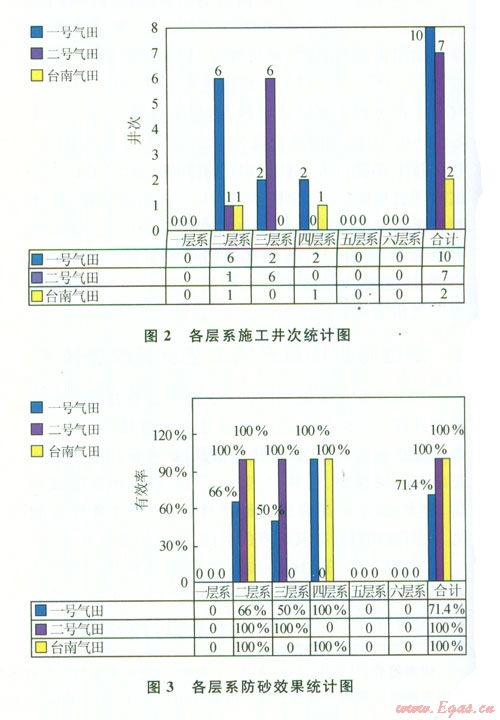 割縫篩管壓裂充填工藝自2000-2011年底,共實(shí)施19井次。其中:①一號(hào)氣田應(yīng)用10井次,總體有效率70%,最長(zhǎng)有效期4年以上。在二層系應(yīng)用6井次,有效率67%;在三層系應(yīng)用2井次,有效率50%;在四層系應(yīng)用2井次,有效率l00%。②二號(hào)氣田應(yīng)用7井次,總體有效率l00%。在二層系應(yīng)用l井次,有效率100%;在三層系應(yīng)用6井次,有效率l00%。③臺(tái)南氣田應(yīng)用2井次,總體有效率l00%。在二層系應(yīng)用1井次,有效率l00%;在四層系應(yīng)用l井次,有效率100%(圖2、3)。