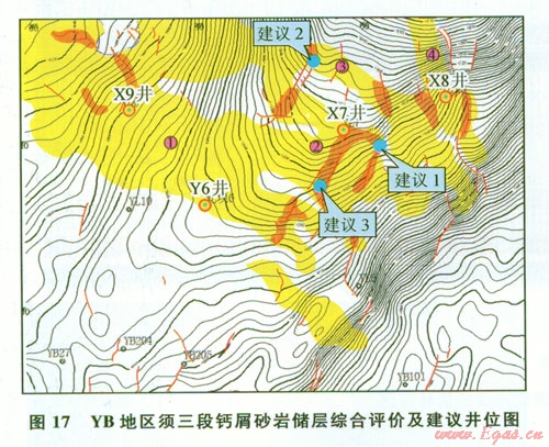 通過鈣屑砂巖沉積特征分析,確定鈣屑砂巖沉積在水退層序頂部的分流河道中,利用沉積相、地震屬性分析,實現(xiàn)鈣屑砂巖分布預(yù)測;通過區(qū)域應(yīng)力場,局部應(yīng)力、構(gòu)造變形特征分析、裂縫成因演化分析,確定須三段層有利裂縫為網(wǎng)狀裂縫,具有“雜亂反射”特征,利用多種地震屬性實現(xiàn)裂縫預(yù)測;通過儲層上部地層存在的削截現(xiàn)象,實現(xiàn)了短期沉積暴露面分布預(yù)測。結(jié)合以上預(yù)測結(jié)果,實現(xiàn)YB地區(qū)須三段鈣屑砂巖儲層油氣富集區(qū)綜合預(yù)測。預(yù)測結(jié)果顯示油氣富集區(qū)主要集中在鈣屑砂巖發(fā)育帶疊加構(gòu)造裂縫發(fā)育帶,在此基礎(chǔ)上分別在1號、2號、3號砂體提交了3口開發(fā)建議井井位(17)。