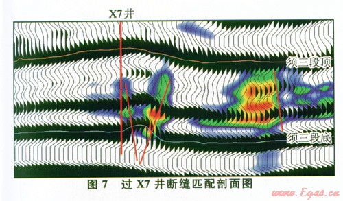 通過合成地震記錄標(biāo)定,確定X7井須三段鈣屑砂巖儲層為強振幅地震反射特征,砂體頂?shù)追謩e對應(yīng)強波峰或者強波谷;地震剖面上測試段砂體表現(xiàn)為“透鏡狀”反射特征,表明砂體為分流主河道砂體;X7井測試段東部200 m處發(fā)育2條小斷裂,斷裂僅僅發(fā)育在須三段內(nèi)部,對X7井儲層段油氣富集具有積極作用。過井剖面儲層段地震波形具有微弱的“雜亂”反射特征,反映儲層段位裂縫可能發(fā)育,與實際薄片鑒定結(jié)果基本一致(3)。