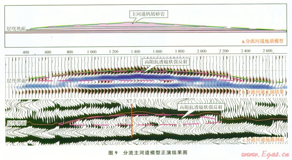9是分流主河道地質(zhì)模型正演結(jié)果與實際地震剖面對比圖。圖9中顯示分流主河道因該具有高阻抗、透鏡狀、強反射”地震響應(yīng)特征,與實際過井地震剖面特征一致。因此可以利用“高阻抗、強振幅、透鏡反射”預(yù)測分流主河道鈣屑砂巖分布。