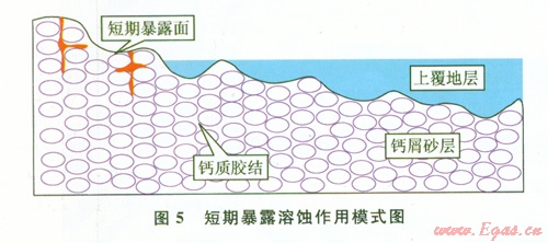 早期短期暴露溶蝕作用是指在砂巖沉積后,由于砂體處于短期的古地理高部位,短期內(nèi)后期沉積物沒有覆蓋到沉積地層,或者沉積后存在小范圍的不整合面,導(dǎo)致大氣淡水以及地表滲流水對易于溶蝕的鈣屑砂巖地層進(jìn)行溶蝕、滲透,在靠近地表地區(qū)形成一定規(guī)模的溶蝕縫洞系統(tǒng)(5)[5]。但早成巖階段形成的溶蝕縫洞規(guī)模有限,在中-晚期成巖階段容易被膠結(jié)、壓實、充填,對儲層孔隙建設(shè)的作用非常有限。