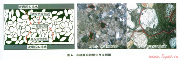 晚期有機酸溶蝕作用是指在須三段泥巖壓實過程中排出的有機酸對鈣屑砂巖中的碳酸鹽鹽巖膠結(jié)物以及碳酸鹽巖碎屑顆粒進(jìn)行溶蝕,形成溶蝕裂縫及溶蝕孔隙(6)。