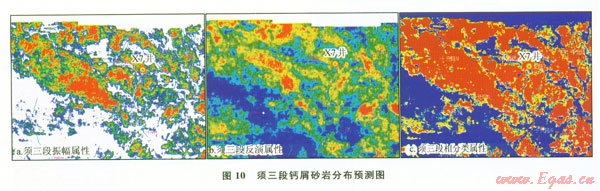 利用振幅屬性、反演屬性、相分類屬性分別對鈣屑砂巖分流主河道的“強振幅、高阻抗、透鏡反射”異常分布進(jìn)行預(yù)測(10),最終實現(xiàn)分流主河道分布綜合預(yù)測。