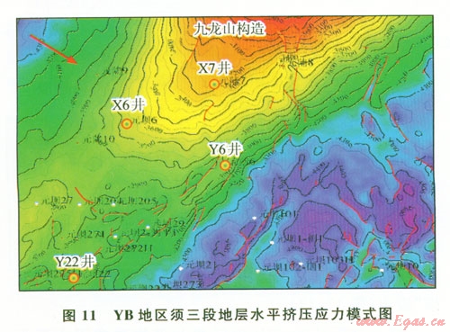 YB構(gòu)造位于四川盆地北部,地處龍門山前、米倉山前、大巴山前推覆褶皺帶交合處,具有三重構(gòu)造應(yīng)力擠壓背景。元陸7井附近地層屬于九龍山構(gòu)造西南翼斜坡帶,其構(gòu)造應(yīng)力主要來源于龍門山南東向的水平構(gòu)造擠壓應(yīng)力以及大巴山縱向擠壓造成的膏鹽巖“上拱”應(yīng)力(11、12)。