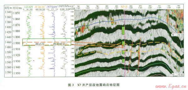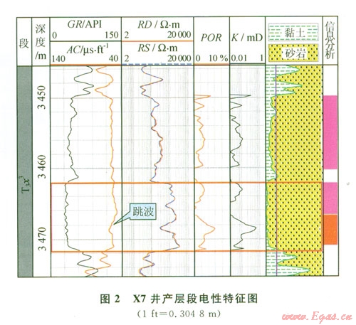 X7井須三段產(chǎn)層段砂體表現(xiàn)為很低的伽馬值(30API),測井電阻率遠(yuǎn)遠(yuǎn)高于上部砂體(8001 000 Ω· m),反映砂體致密,并且含有較多的鈣質(zhì)碎屑,低聲波時差55μsft(1 ft=03048 m),反映砂體主要為高阻抗砂體。在3468 m存在典型的聲波跳波現(xiàn)象,反映該處可能裂縫發(fā)育(2)。