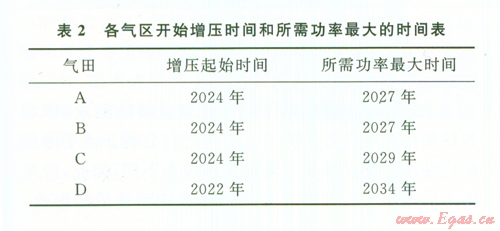 各氣區(qū)后期壓力產(chǎn)量見(jiàn)表1,增壓時(shí)間和所需功率最大時(shí)間見(jiàn)表2。根據(jù)表l、2對(duì)兩個(gè)增壓方案進(jìn)行詳細(xì)論證比選。