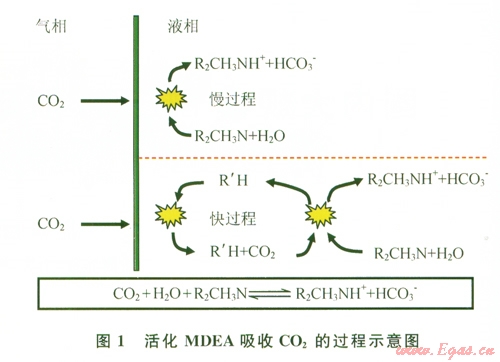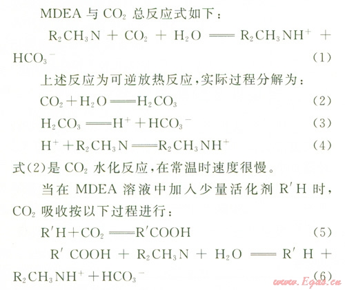 從式(1)(5)、(6)可知,RH只是起傳遞C02的作用,是循環(huán)使用的。加入活化劑RH后式(5)的反應(yīng)相比式(2)的反應(yīng)要快得多,活化劑加快了反應(yīng)速度,減少了反應(yīng)時(shí)間,提高了MDEA溶液吸收C02的能力(1),降低了整個(gè)裝置循環(huán)量和填料高度,減少了裝置投資并具有節(jié)能效果。