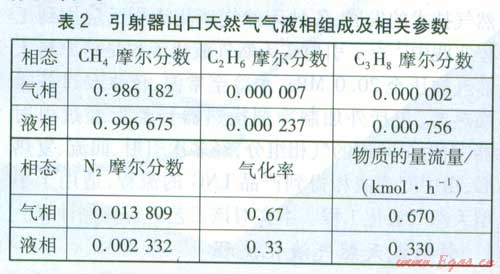 初始運(yùn)行時(shí),原料氣冷卻所需冷量由外加制冷劑提供。當(dāng)換熱器3出口的天然氣溫度達(dá)到203.15 K時(shí),天然氣從拉法爾噴管?chē)姵霾⑦M(jìn)入引射器,由于沒(méi)有被引射氣體,故此刻僅以原料氣組分從引射器出口流出,控制其出口溫度使之在1.2 MPa壓力下的氣化率為0.67。通過(guò)比較計(jì)算結(jié)果和實(shí)驗(yàn)結(jié)果,可得出用SRK方程計(jì)算烴類混合物的氣液相平衡是可靠的H 3,本文選用SRK方程計(jì)算天然氣氣液相的相平衡。利用ASPEN.HYSYS7.2計(jì)算得前述天然氣組成,并且得出引射器出口溫度為152·43 K。引射器出口天然氣氣液相組成及相關(guān)參數(shù)見(jiàn)表2。