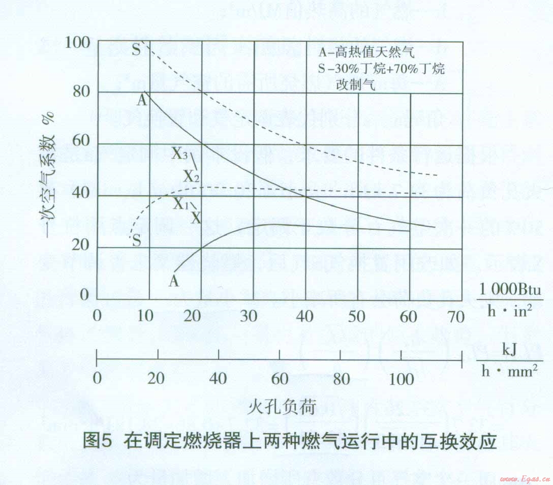 這說(shuō)明用高熱值天然氣調(diào)定后的燃燒器在改用高惰性天然氣置換后,其運(yùn)行工作點(diǎn)x。已高于高惰性天然氣的離焰極限曲線值(見圖4中X1的位置),會(huì)發(fā)生離焰。顯然,如調(diào)定點(diǎn)x置于調(diào)定氣的極限曲線上(一次空氣系數(shù)接近60%一見圖4),則置換后的工作點(diǎn)X1將遠(yuǎn)高于置換氣的離焰曲線(圖上未表示),這一運(yùn)行工況是完全不能接受的。在這一特殊的假設(shè)條件下,如燃燒器的調(diào)定是在同樣的火孔負(fù)荷下,但一次空氣系數(shù)略低于50%(約為42%,其工作點(diǎn)在圖4上用X1表示,則在用高惰性天然氣置換后,一次空氣百分?jǐn)?shù)增加到PAx3=PAX2×1.1744=0.42×1.1744=0.4932即49.30%