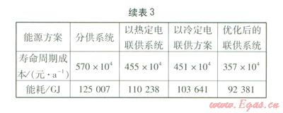 以熱定電聯供方案按照吸收式機組供熱量與熱負荷之比確定。經模型優(yōu)化后,當聯供系統壽命周期成本最小時,吸收式機組供熱量與熱負荷之比為0.4,即以熱定電聯供方案中吸收式機組的供熱量確定為熱負荷的40%,再根據吸收式機組的制熱性能系數確定所需熱量,從而確定以熱定電聯供系統的配置方案。以冷定電聯供方案的確定與以熱定電聯供系統方法基本一致,區(qū)別在于,經模型優(yōu)化后,當聯供系統壽命周期成本最小時,吸收式機組的供冷量與冷負荷之比為0.3。由表3可知,優(yōu)化后的聯供系統壽命周期成本及能耗最低,這表明優(yōu)化后的聯供系統在經濟性及節(jié)能方面均具有一定優(yōu)勢。