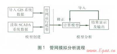 簡(jiǎn)單地說(shuō),管網(wǎng)模擬就是依據(jù)管網(wǎng)信息管理系統(tǒng)的GIS中管網(wǎng)實(shí)際情況,在新的界面中構(gòu)造出模型,通過(guò)對(duì)模型的統(tǒng)計(jì)處理形成所需要的計(jì)算模型,然后進(jìn)行分析模擬。因此,管網(wǎng)的模擬分析可以分為兩大模塊:模型創(chuàng)建與模型分析。管網(wǎng)模擬分析流程見(jiàn)圖l。