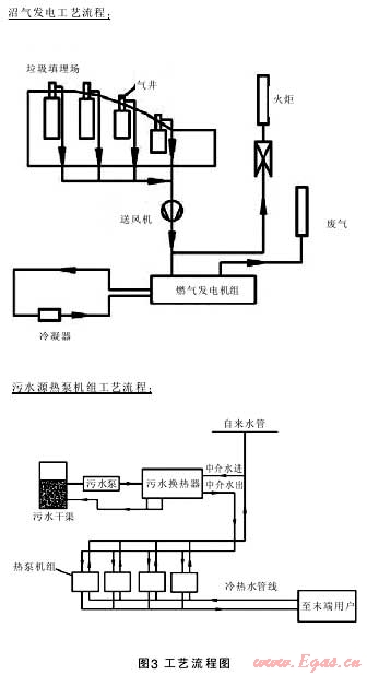 以水源熱泵技術為基礎,結合其它新能源技術和建筑技術,我們認為可以將污水源熱泵、沼氣和燃氣發(fā)電技術結合應用,并進行相關工藝技術和設備的研發(fā)。