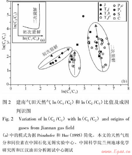 (1)天然氣的成分組成具有原油二次裂解氣的特征。飛三段(T1f3)和長興組(P2c)天然氣的烷烴氣中以甲烷為主(相對含量在99%以上),為成熟度很高的干氣。有機(jī)成因的烷烴氣大致包括生物氣、干酪根熱解氣和原油裂解氣。本區(qū)天然氣甲烷的碳同位素在-30.0‰~-33.0‰,可排除生物成因氣。因此,對本區(qū)天然氣的成因判識的關(guān)鍵是區(qū)分干酪根熱解氣和原油裂解氣。這兩類成因天然氣,目前國內(nèi)外學(xué)者主要用ln(C1/C2)與ln(C2/C3)關(guān)系圖進(jìn)行判識[10-13]。干酪根初次熱解氣以甲烷的迅速增加為特征,ln(C1/C2)值不斷增大而ln(C2/C3)值相對穩(wěn)定;原油二次裂解氣以丙烷的迅速減少為特征,ln(C2/C3)值明顯增大而ln(C1/C2)值變化不大(圖2(a))。如圖2(b),研究區(qū)嘉陵江組(T1j)、飛三段(T1f3)、長興組(P2c)和下二疊統(tǒng)(P1)天然氣的ln(C1/C2)值在5~7,ln(C2/C3)值在1~4,總體符合ln(C2/C3)迅速增大、ln(C1/C2)相對穩(wěn)定的原油二次裂解氣的基本特征,志留系(S)與石炭系(C)的天然氣(ln(C1/C2)值在4~5,ln(C2/C3)值在1~2.5)也具有類似的特征,但分布范圍與前者明顯區(qū)別,表明這兩類天然氣的來源可能不同。三疊系巴東組(T2b)和侏羅系(J)的天然氣的ln(C1/C2)值在2.5~3.5,ln(C2/C3)值在1~2.5,總體表現(xiàn)為ln(C1/C2)值不斷增大而ln(C2/C3)值相對穩(wěn)定的干酪根初次熱解氣的特征。